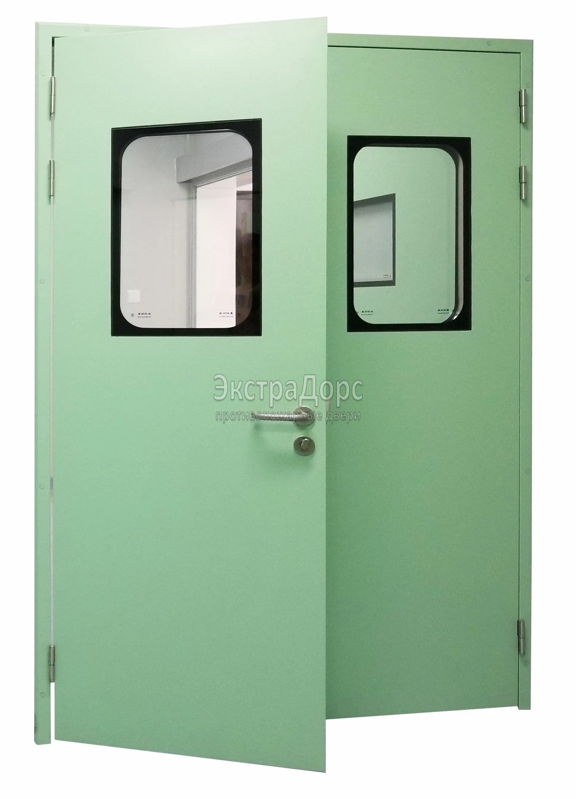 Двухстворчатая огнестойкая дверь EIW 60 зеленая со стеклом в Балашихе