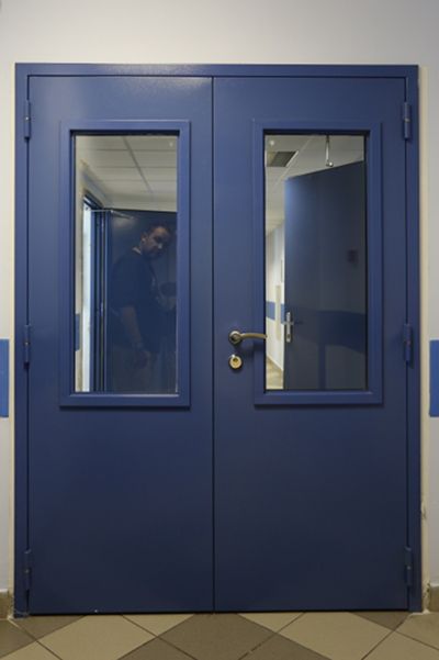 Противопожарная алюминиевая дверь синего цвета в Балашихе